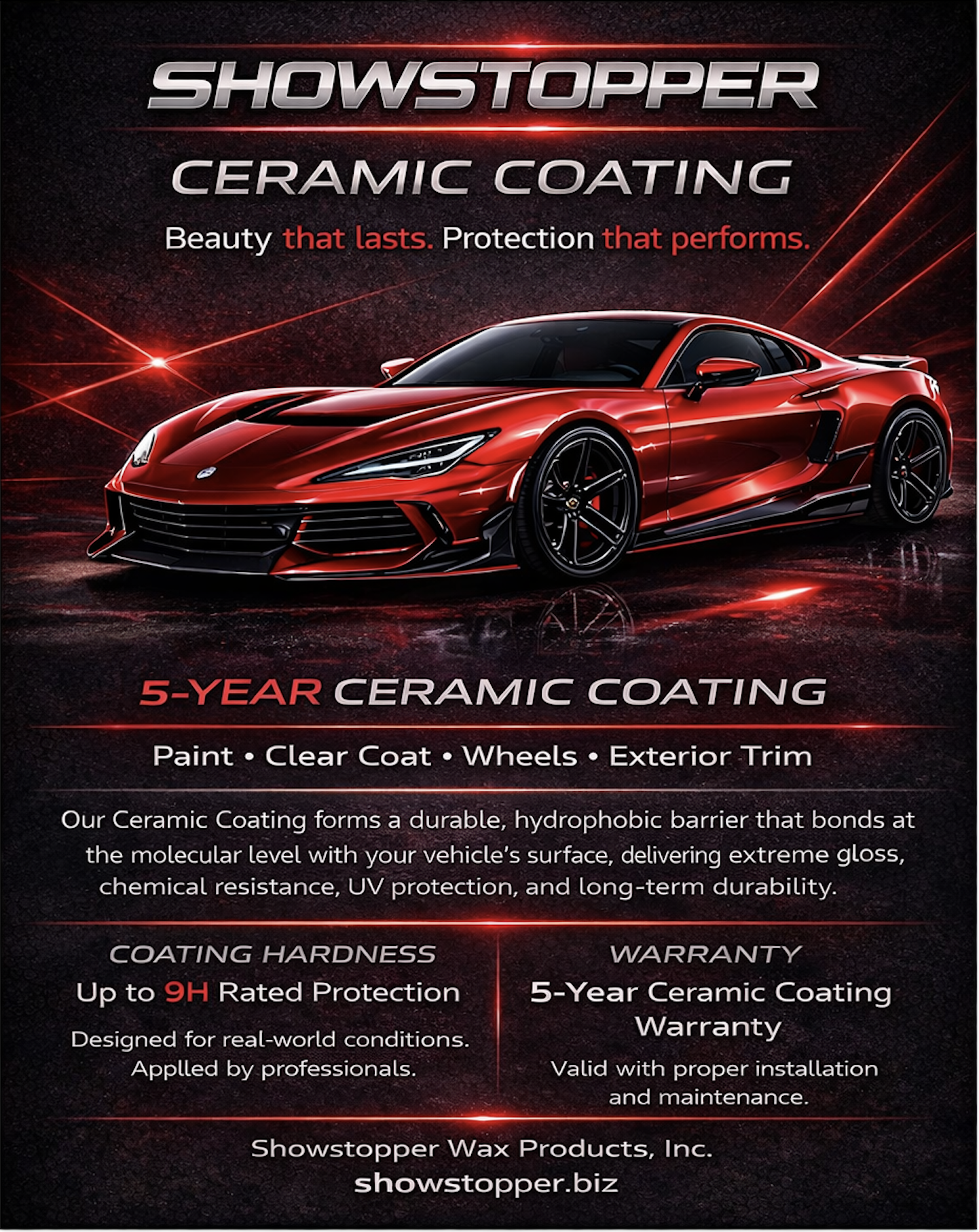 Our Ceramic Coating forms a durable, hydrophobic barrier that bonds at the molecular level, delivering extreme gloss, chemical resistance, UV protection, and **5-Year long-term durability**. Applied by professionals, it provides up to **9H Rated Protection** for Paint, Clear Coat, Wheels, and Exterior Trim.